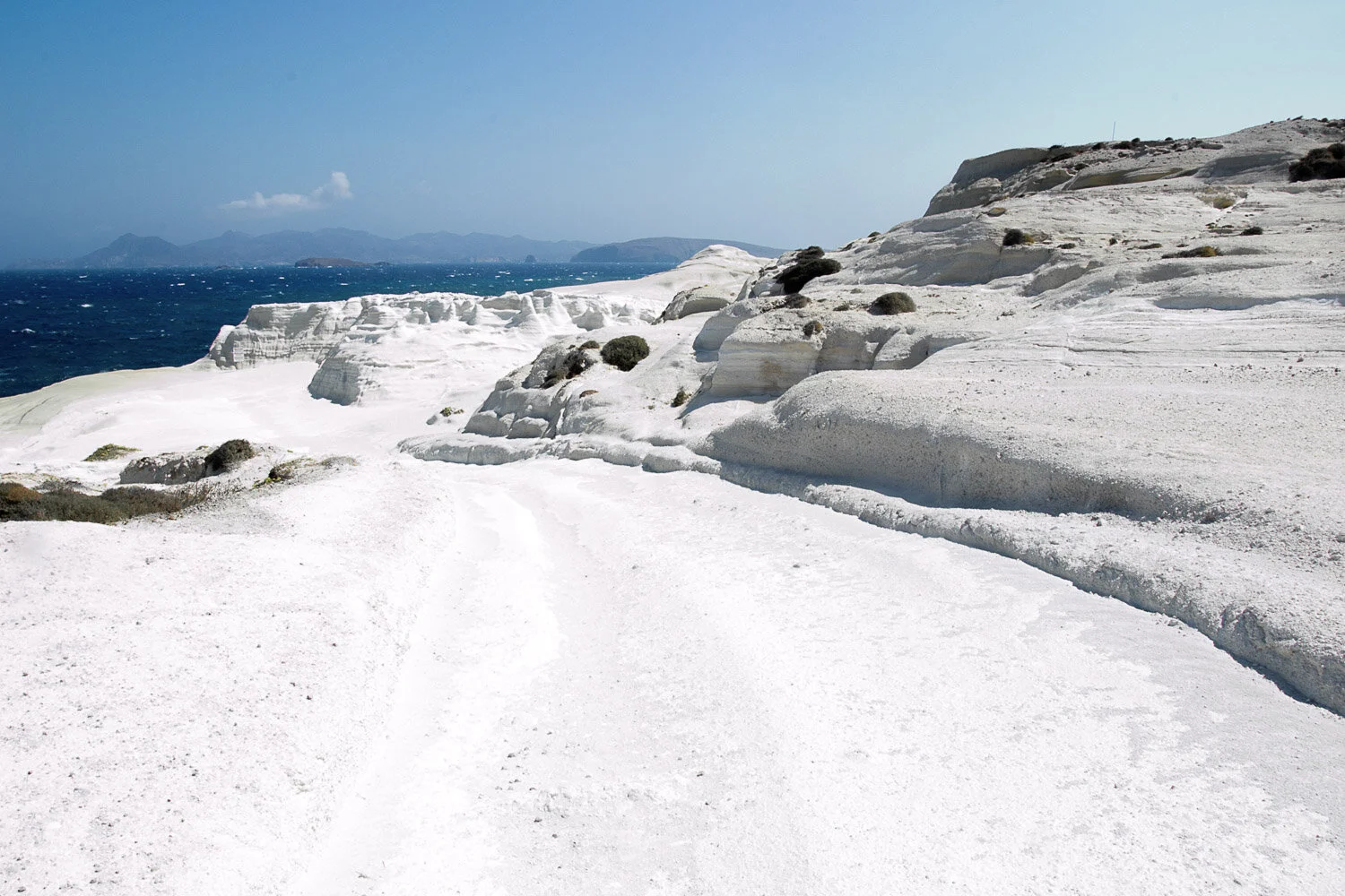 L’ultimo giorno cambiamo hotel per alloggiare in un delizioso appartamento sulla collina accanto alla spiaggia più suggestiva dell’isola, Sarakiniko. Arrivati alla scogliera un panorama lunare ci accoglie, con distese di scogliere di gesso bianchissime,sullo sfondo di un mare di colore smeraldo. Il paesaggio è formato da scogliere piatte solcate dal vento, che quel giorno non ci lascia tregua, e a causa del mare troppo mosso possiamo fare il bagno solo in una piccola baia riparata. Il mare mosso si infrange nelle grotte scavate nelle scogliere in un panorama davvero unico e surreale.